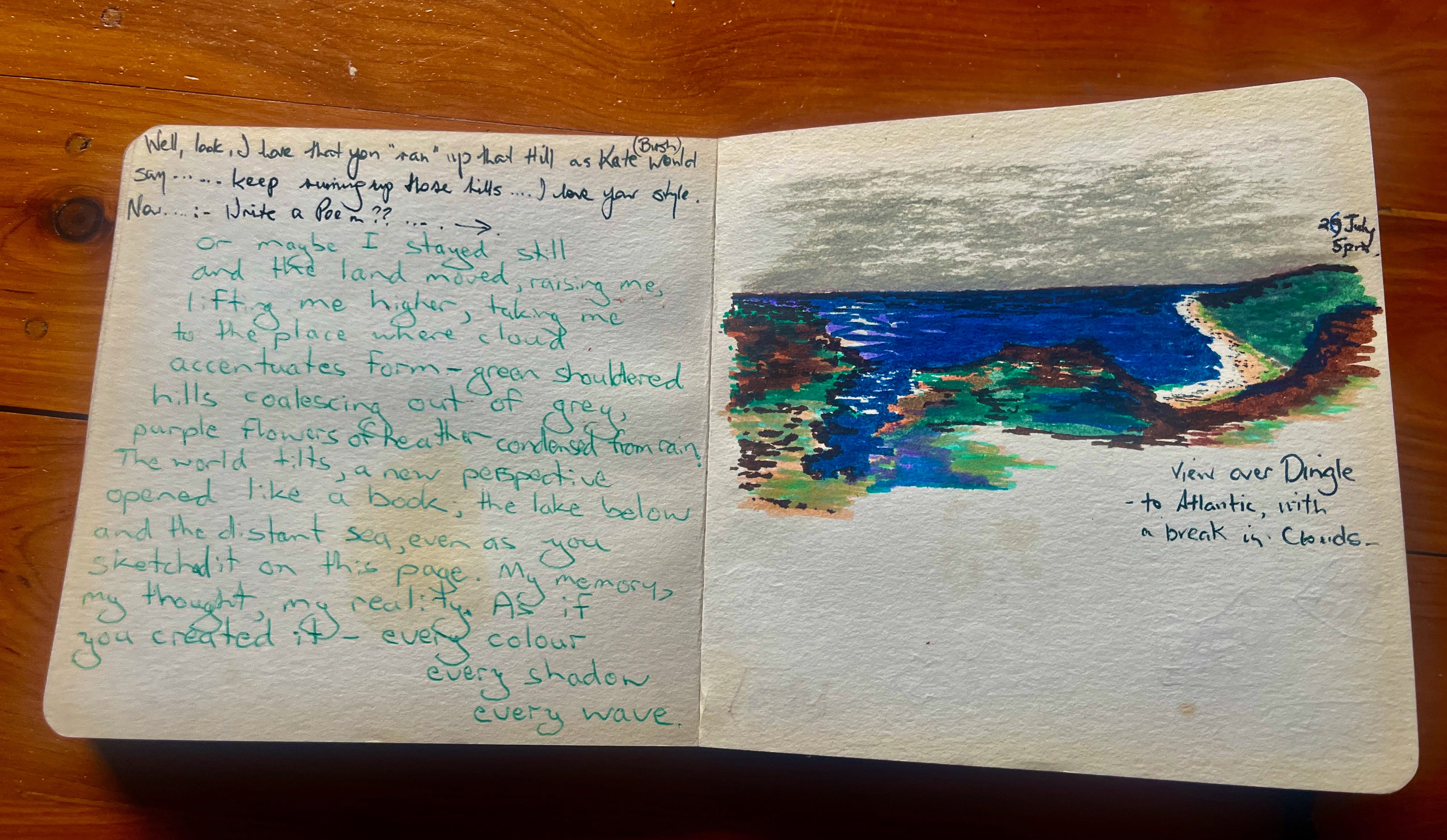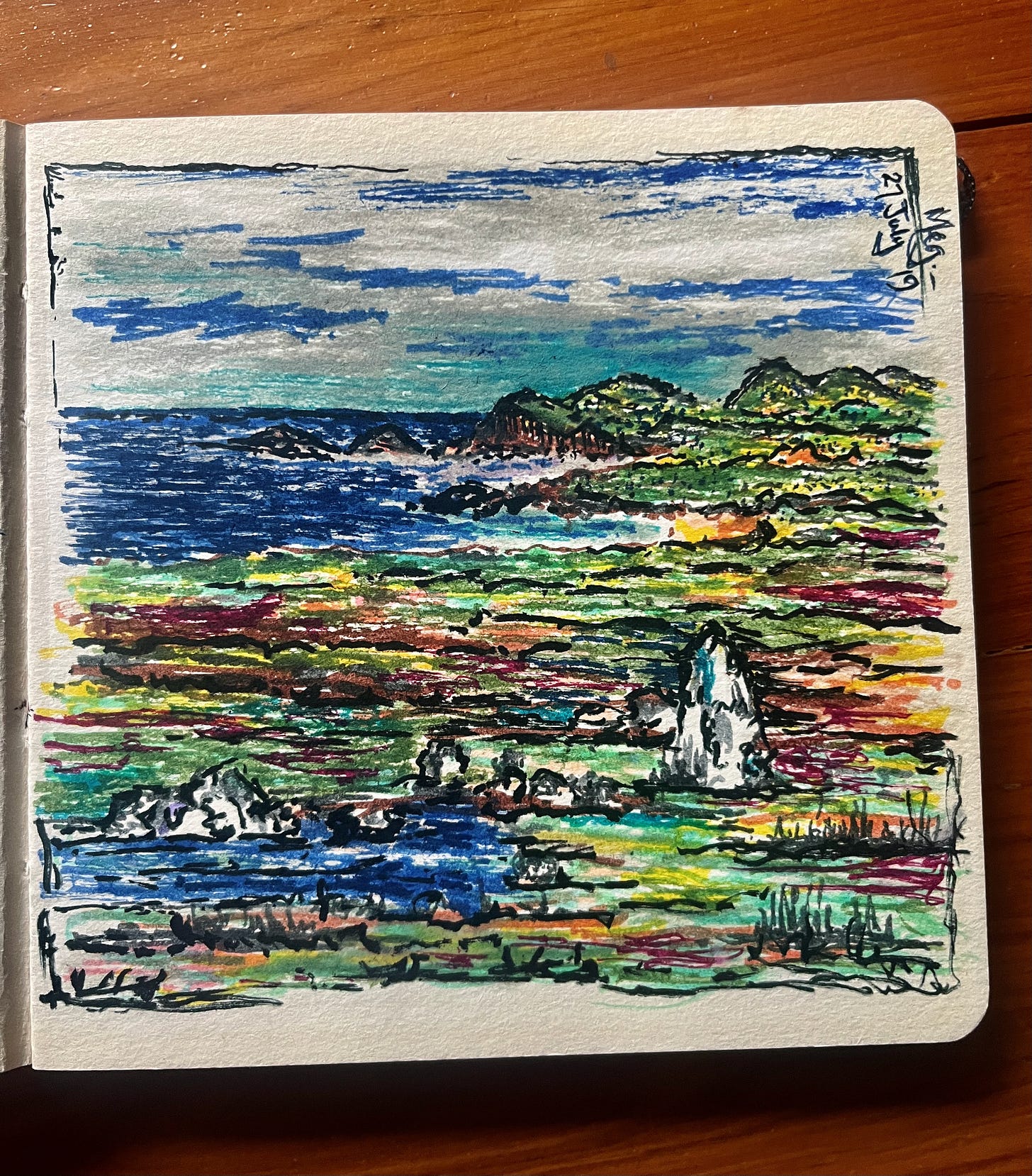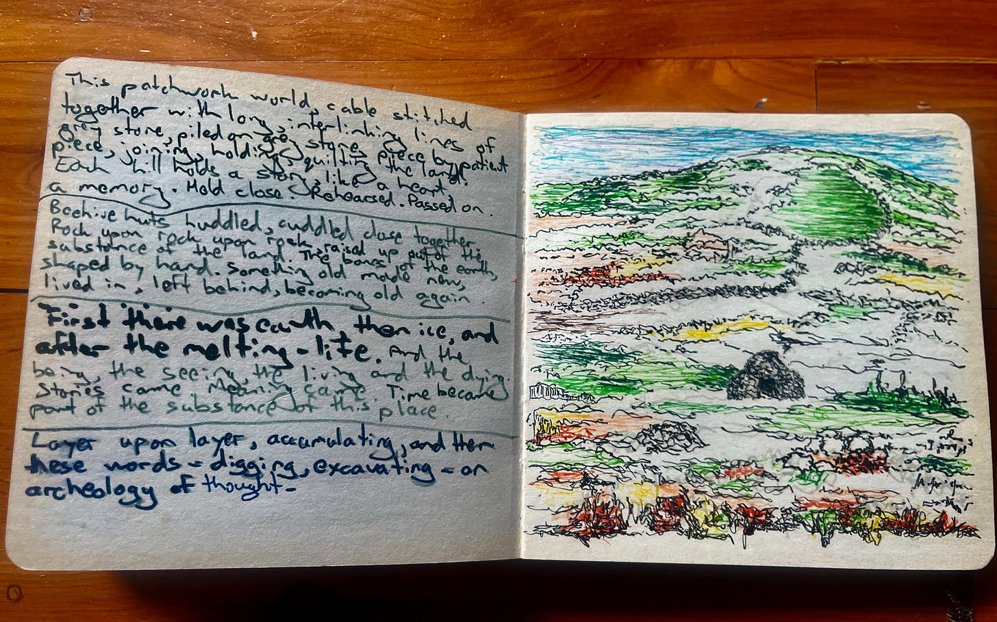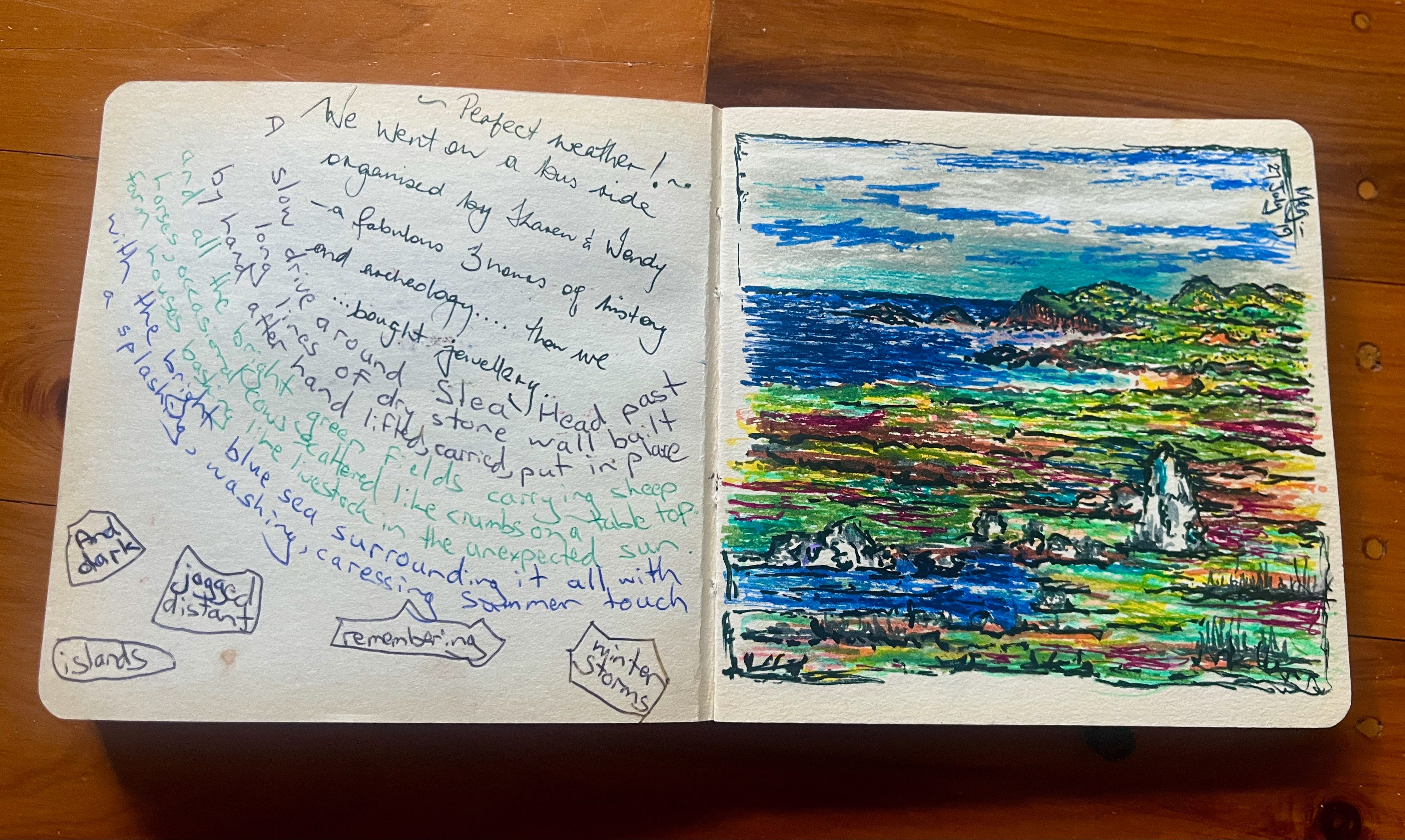 The pictures are from our travel diary - Meg’s art created rapidly on the spot, at various places we briefly visited, with my words, and sometimes some of hers, alongside.