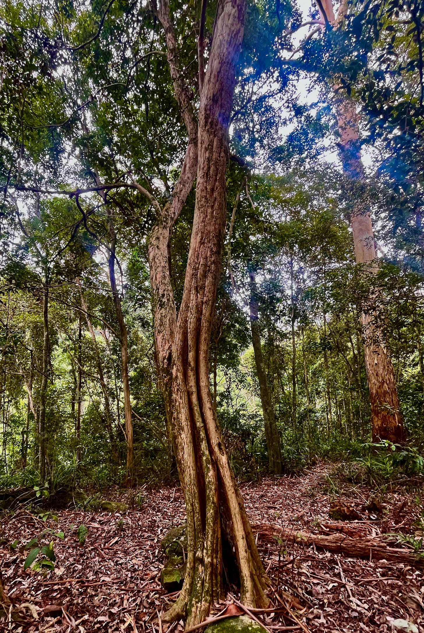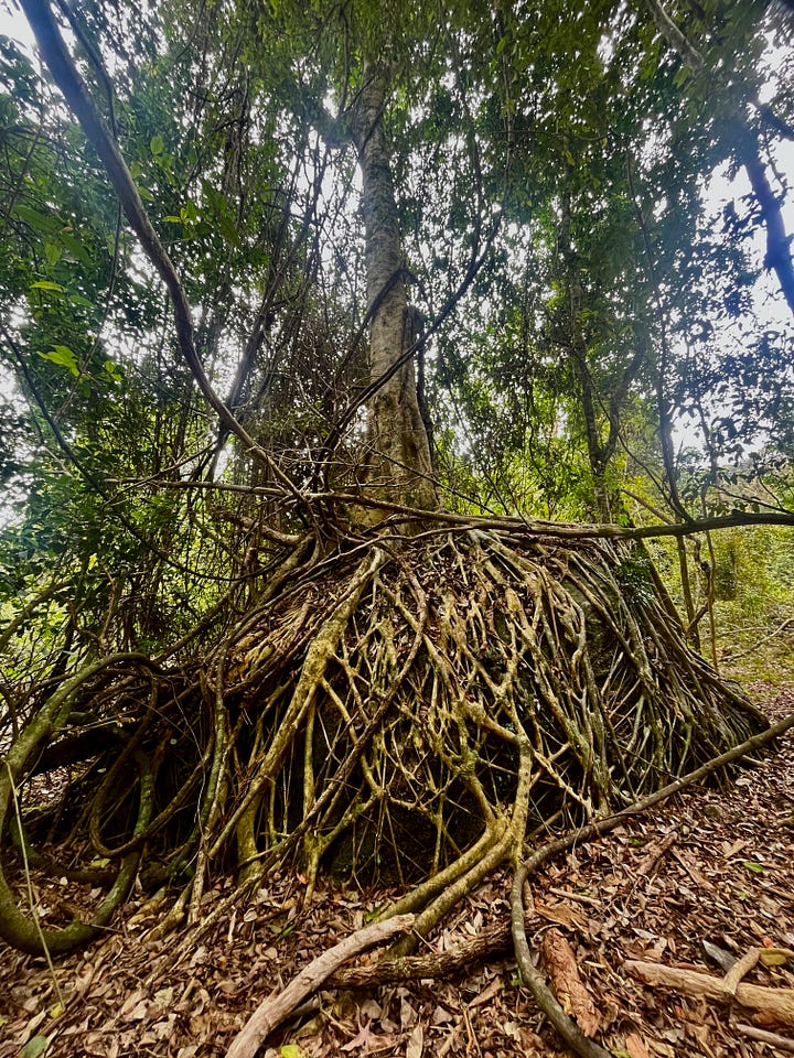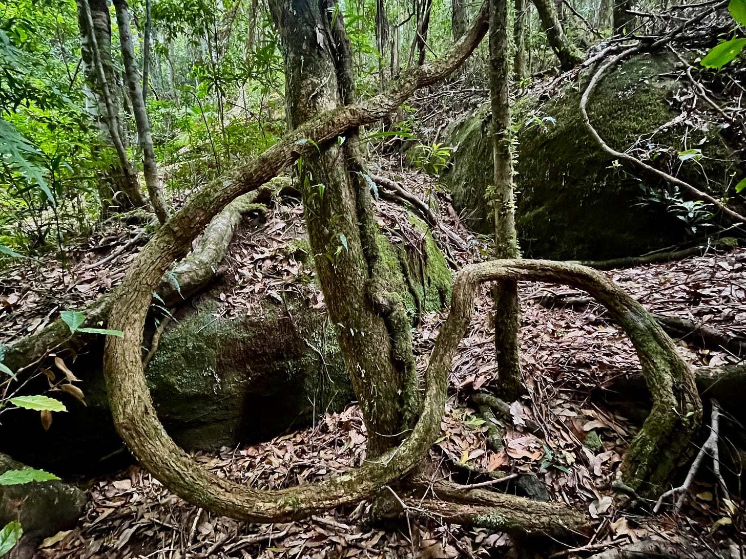 With no formed track the way forward is no single way. Straight lines do not exist here. Sometimes “forward” is sideways - left or right and back again. Sometimes it is up and over. Sometimes it is sliding under, or going backwards and around. The delight - and art - of off track walking is to see and sense the warp and weft of the forest and of the land and to insinuate yourself through it by sidestepping and stooping, climbing and bending, the way the plants themselves find a way in which to grow - like this serpentine liana vine, thicker than my arm.