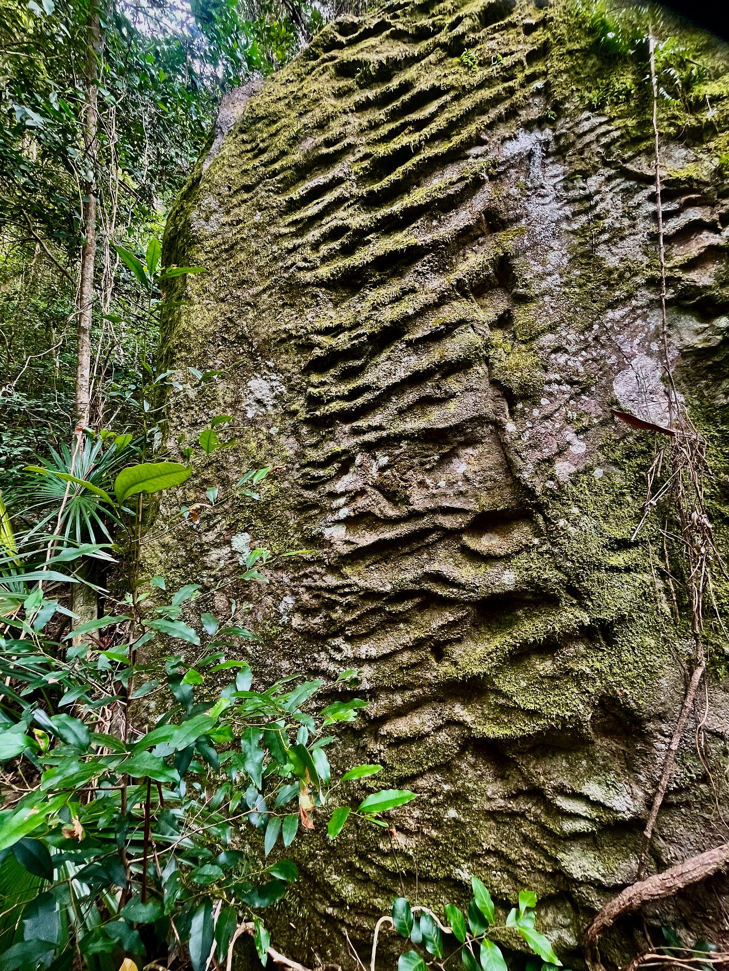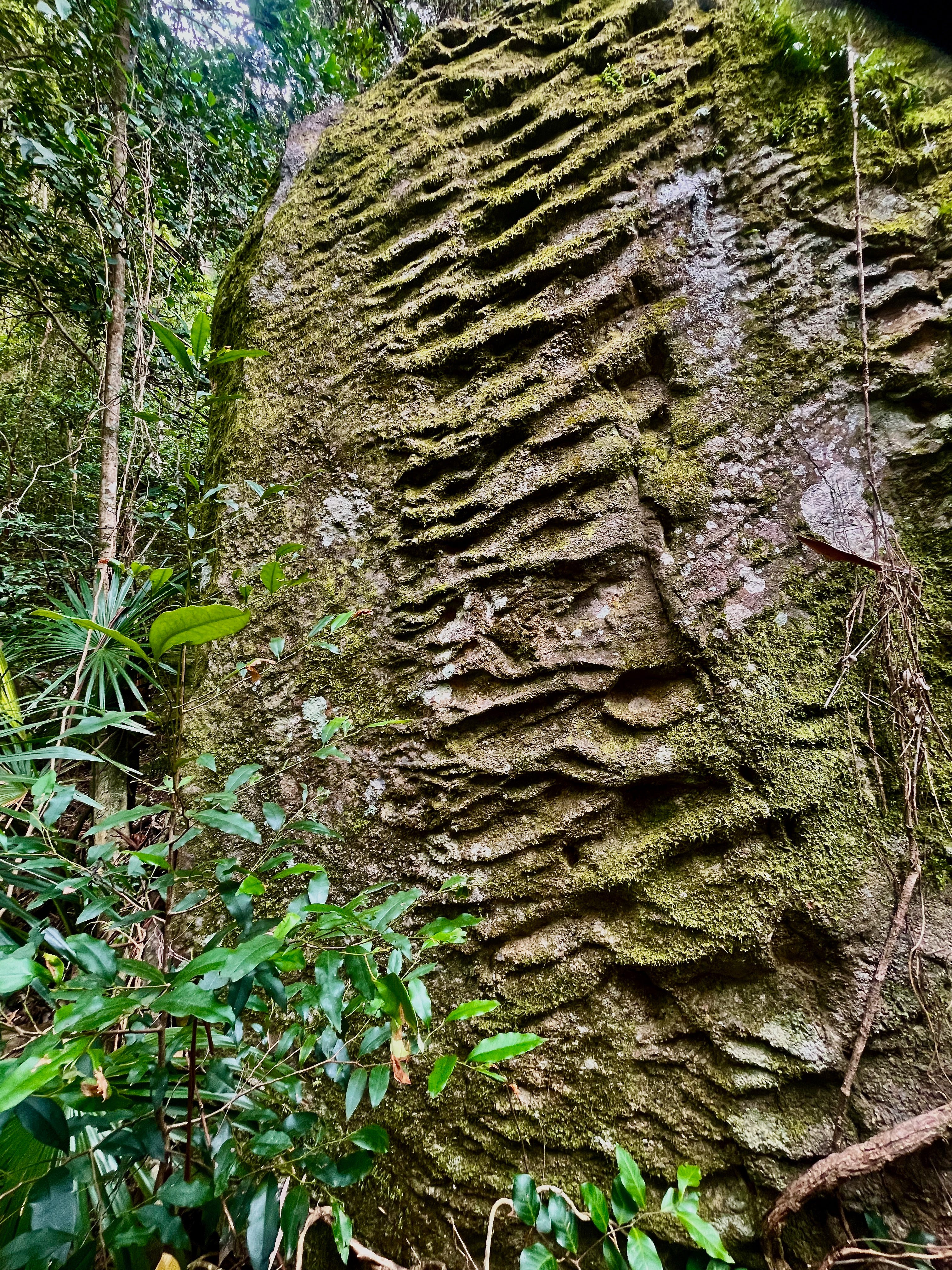 Everything here is texture. Moss softens the surface of a sandstone boulder - clinging to ripples that remember the river which formed them 230 million years ago. Tilted up now by tectonic forces and set inside a rainforest, it looms above me as a monolith inscribed by water. I pause here, closing my eyes and letting my fingertips feel the undulations, a sensuous Braille of time.