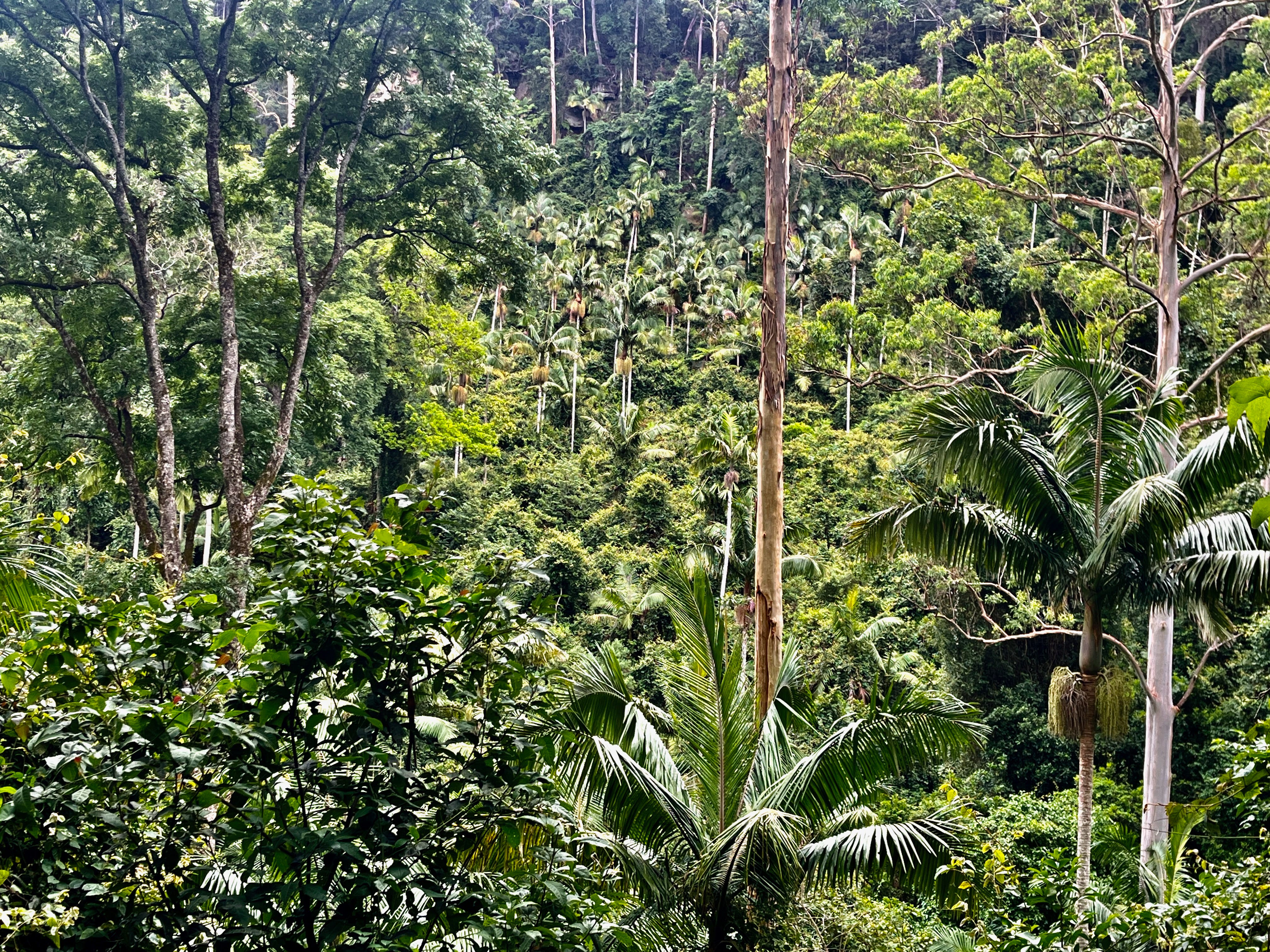 It is afternoon now with the unseen sun slipping westward so I head on up the valley, picking my way carefully along the cliff top to where it merges with the mountainside deep under the trees. Below the dense canopy of the rainforest the air is still and warm and rich with the scent of earth and of growing things. Tall eucalypts are interspersed with some of the largest palm trees I have seen - native Bangalow and Cabbage Palms. Their much smaller offspring cluster around them where their seeds have fallen - sharp black spines on the edge of the Cabbage Palms making me wary of where I walk, but there are are other hazards too - like the thorny Lawyer Vines (Smilax Australis) which form prickly loops and trip wires laced amongst the undergrowth, equally good at snagging skin or clothing. My bare legs are looking a little ragged and bloodied by now.