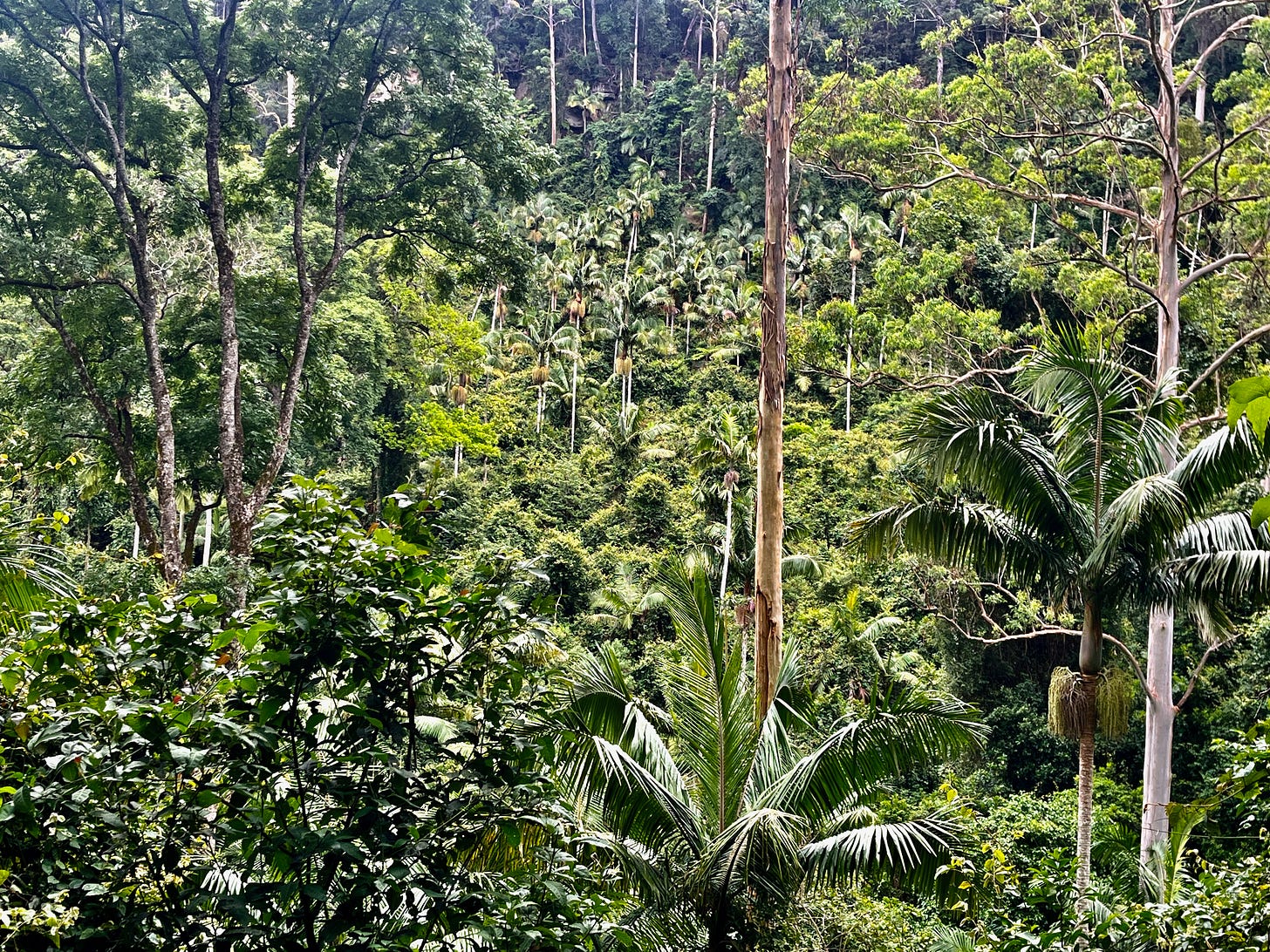 Both are trackless, yet both have an order - the way one thing links to another in nature, organically. An epiphytic fern clings to a tree, accumulating fallen leaves within which insect larvae live - themselves food for frogs and lizards. The bright red seeds of a Bangalow Palm gift a meal for the Green and Crimson King Parrots which flit through the treetops, catching glints of sun.
