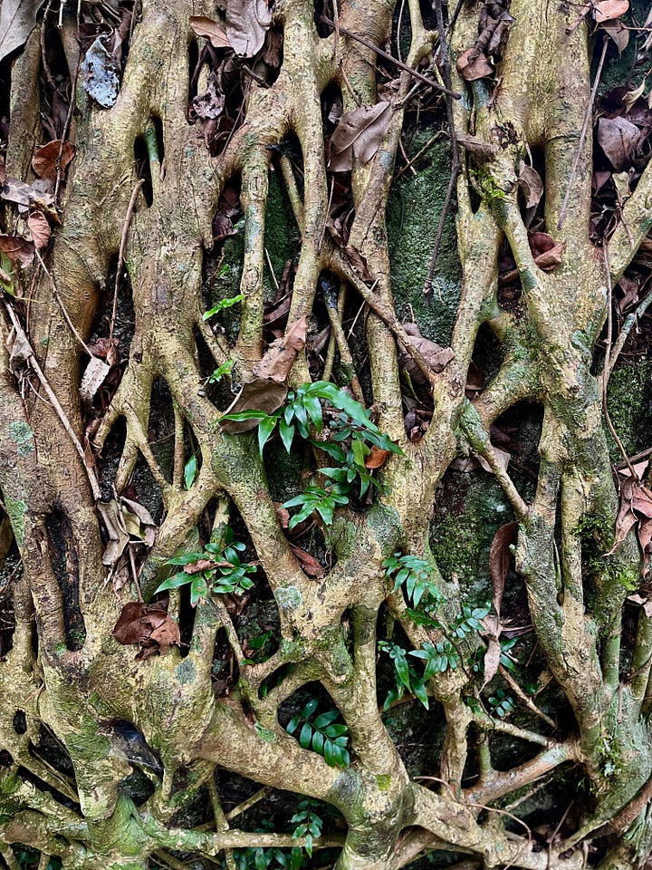 I sit and have lunch on this one anyway because, well …. life. We need to hold tight to it while we can, precarious though it may feel, like this Native Fig that I found laced tight to the block of sandstone it grows upon.