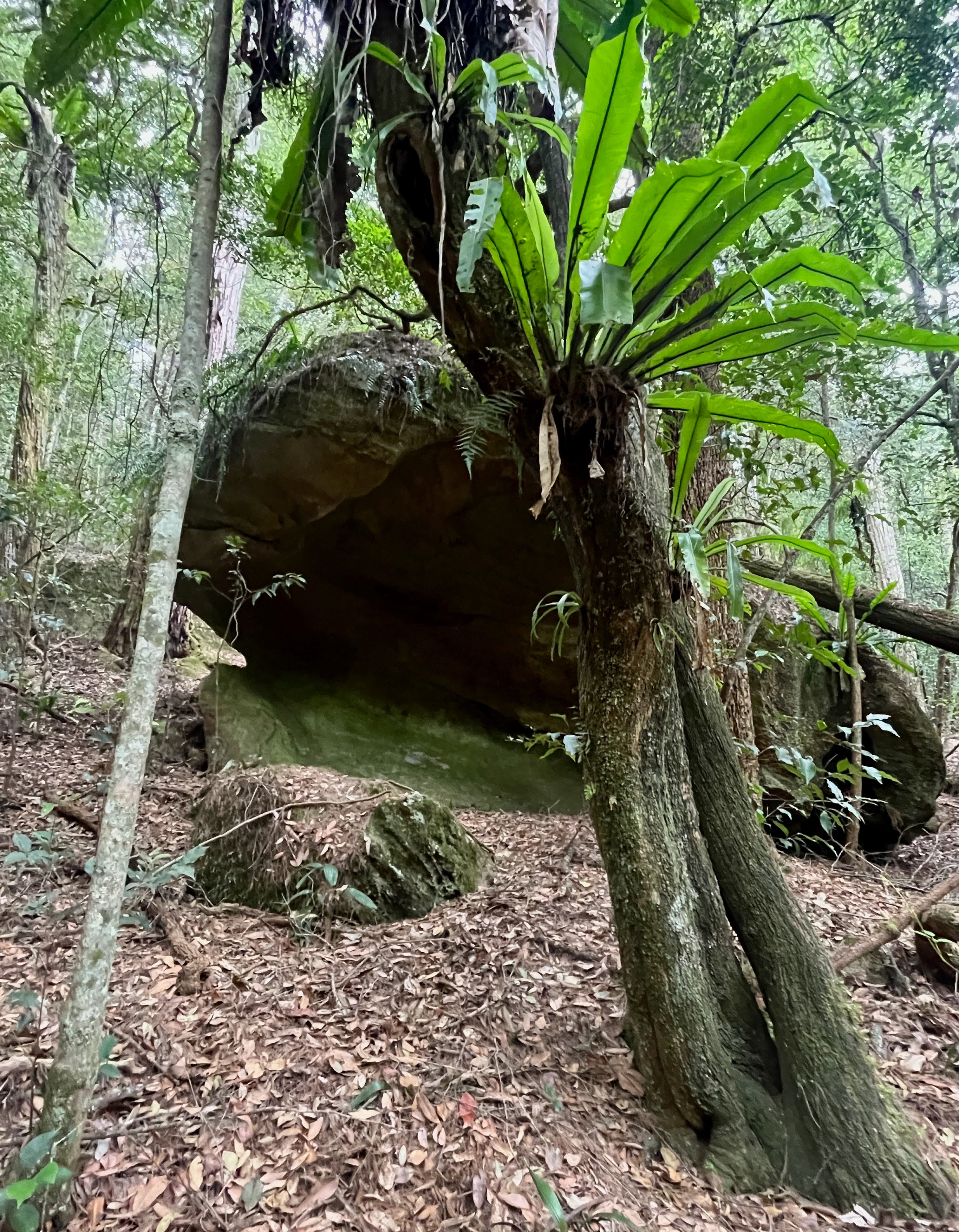 To the Awabakal First Nation Aboriginal people who lived in these mountains for time out of mind this cave beneath a boulder was a bedroom. This terrace outside was a living room and a kitchen. This stream and the forest around it were the water and the food which sustain all life. This trackless forest was always full of footprints.